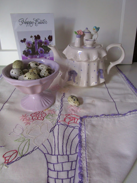 The cute little light purple bowl I bought this week at the thrift store (.50)  The Quail eggs are from the grocery store ( DH kindly "blew" them out then made himself an omelette.