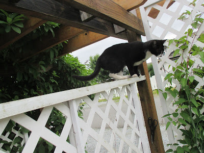 You all have heard about how Miss Kitty showed up a couple of years ago, half-starved and pregnant. She had her 5 adorable babies and in due time they found good homes. She's an outside cat and although I worry that she'll get run over one of these days she has been very lucky. Lately we have a large, long-haired mostly black cat that we've dubbed Hairy or Harry ( depending on his gender ). He's very sweet but Miss Kitty will have nothing to do with him. He sits on the little roof near my kitchen window and peers in at me. I know he wants in but that isn't going to happen. I hope the two of them will become friends. This week another cat appeared. This one is a tabby with a white bib. You'd think word is out that this is the place to be if you're a cat. lol.